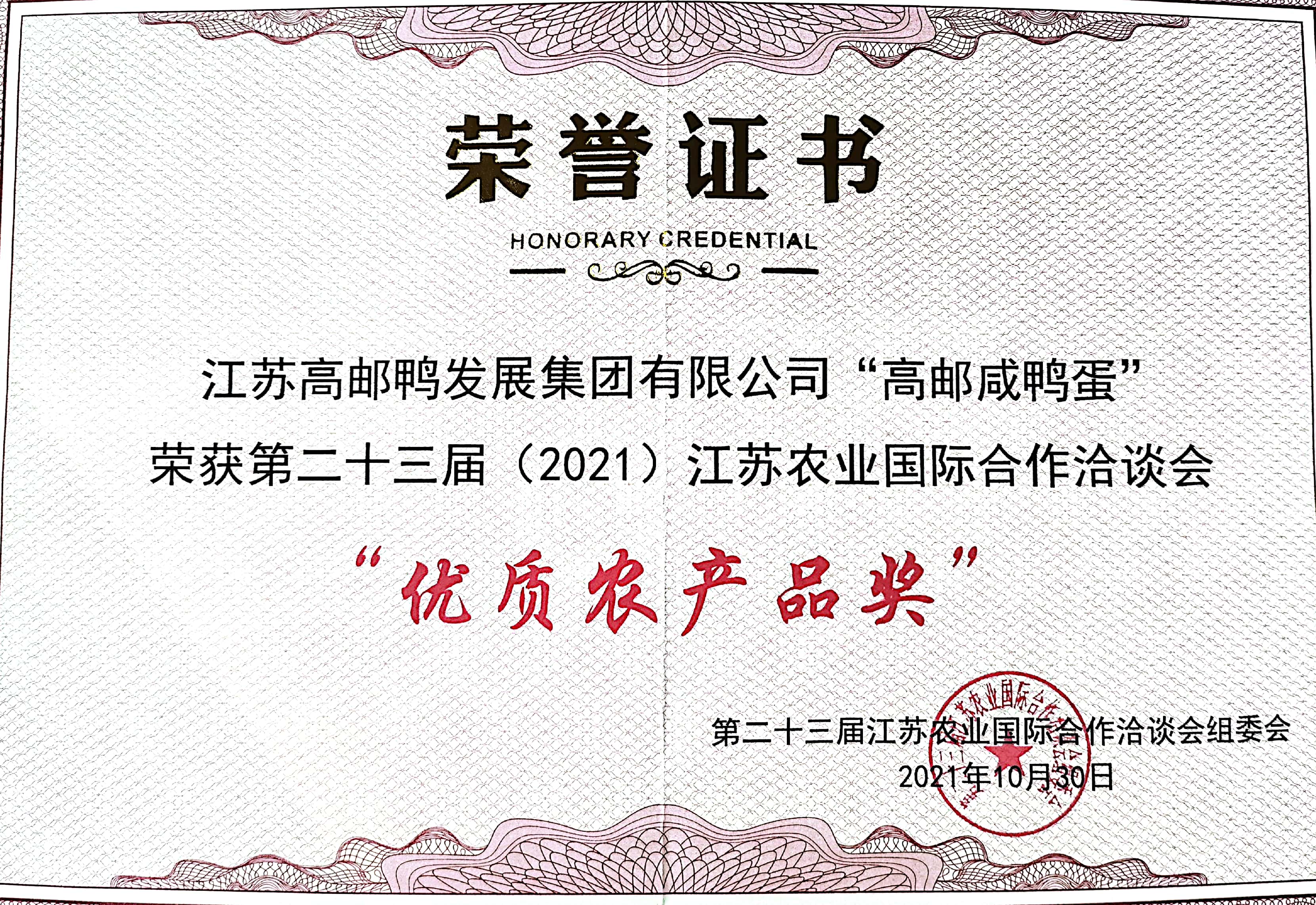 在10月30日上午舉辦的優(yōu)質農產品評選頒獎活動中,江蘇高郵鴨集團“高郵咸鴨蛋”成功榮獲第二十三屆江蘇農業(yè)國際合作洽談會“優(yōu)質農產品獎”,這也是揚州市獲此殊榮的兩家單位之一。