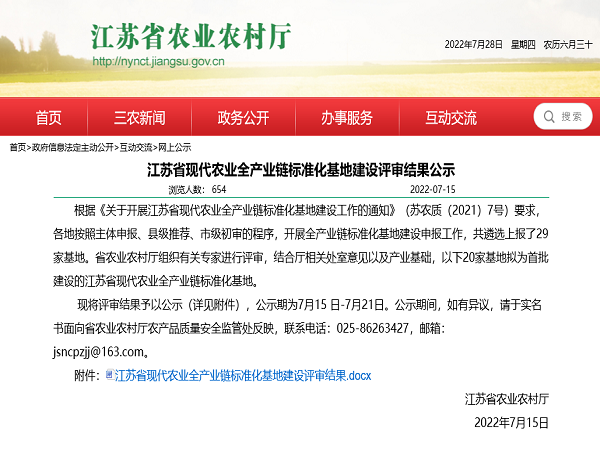 江蘇省現代農業全產業鏈標準化基地建設以高質量發展為主題,以提升農業質量效益和競爭力為目標,突出品種培優、品質提升、品牌打造和標準化生產,構建以產品為主線,以全程質量控制為核心的現代農業全產業鏈標準體系。首批在全省范圍內遴選20家農畜水產品生產主體開展全產業鏈標準化基地建設,實施周期3年,建設周期內將給予項目資金支持,建成后由省農業農村廳聯合省市場監管局共同命名。
