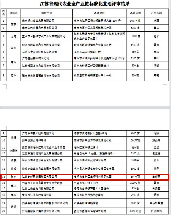 近日,江蘇省農業農村廳公布了首批建設的江蘇省現代農業全產業鏈標準化基地,高郵鴨集團成功入選,也是揚州市唯一一家入選的單位。