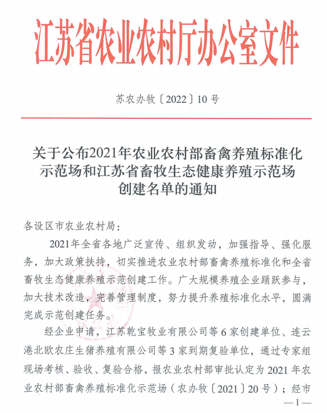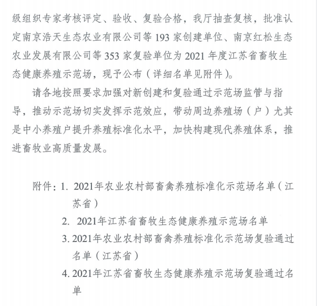 經市級組織專家考核評定、驗收、復驗合格,農業農村廳抽查復核,高郵鴨集團成功獲批江蘇省畜牧生態健康養殖示范場。