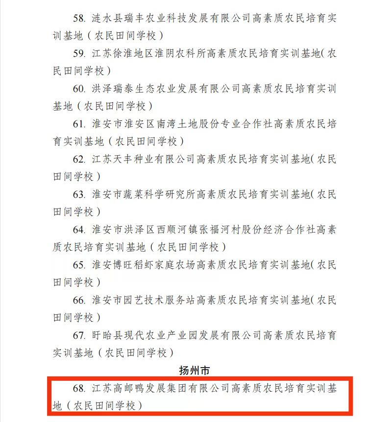 經過前期省市兩級審核、專家組現場評審,近日,江蘇省職業農民培育指導站公布了2022年度省級高素質農民培育實訓基地(農民田間學校)考評結果,高郵鴨集團成功獲評。