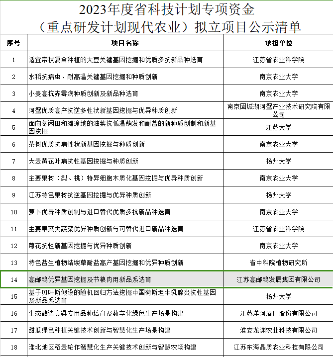 近日,江蘇省財政廳、科技廳公布了2023年度省重點研發計劃(現代農業)專項資金立項項目名單,江蘇高郵鴨集團承擔實施的“高郵鴨優異基因挖掘及節糧肉用新品系選育”榮獲省重點類科技項目立項支持。