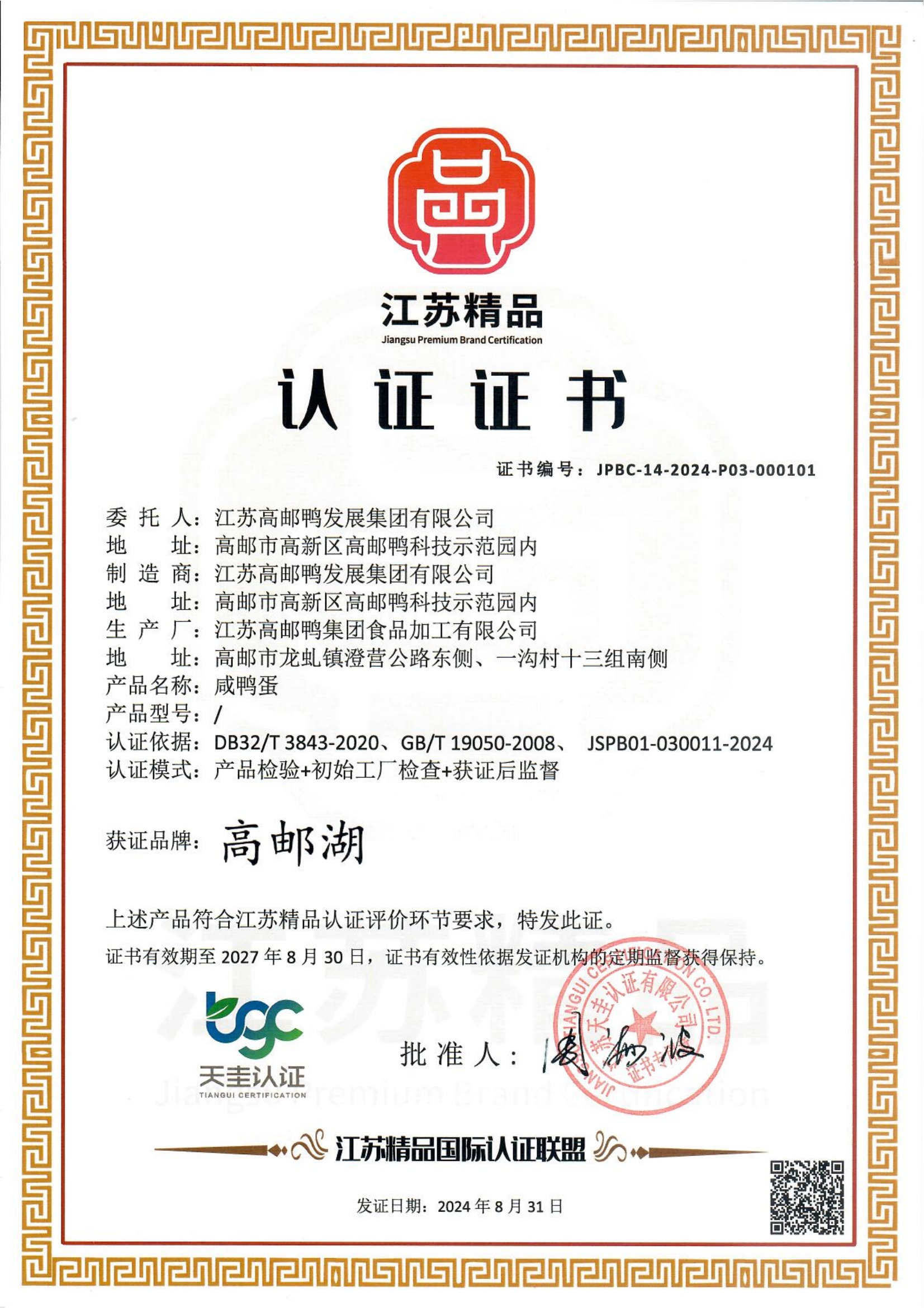 近日,江蘇精品國際認(rèn)證聯(lián)盟為江蘇高郵鴨發(fā)展集團(tuán)有限公司頒發(fā)“江蘇精品”認(rèn)證證書。