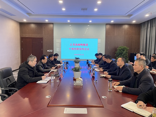 3月11日上午,水投集團組織召開干部任職宣布會議。會議由集團黨委副書記黃強主持,水投集團董事長秦超、副總經理劉廣游、行政人事部負責人等出席會議,高郵鴨集團全體干部職工參加會議。