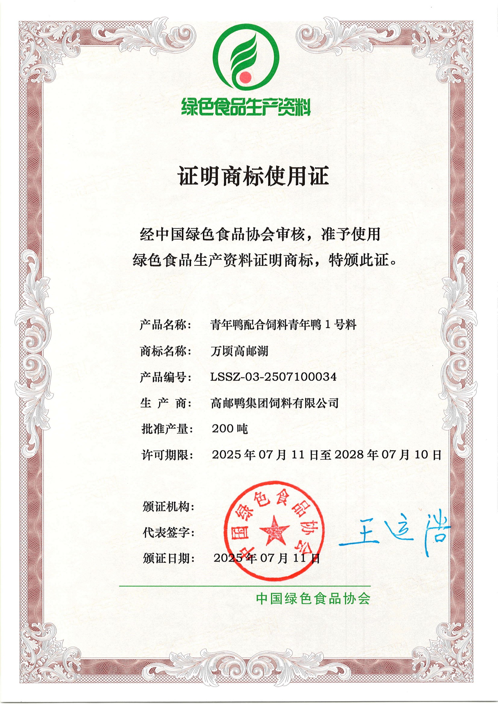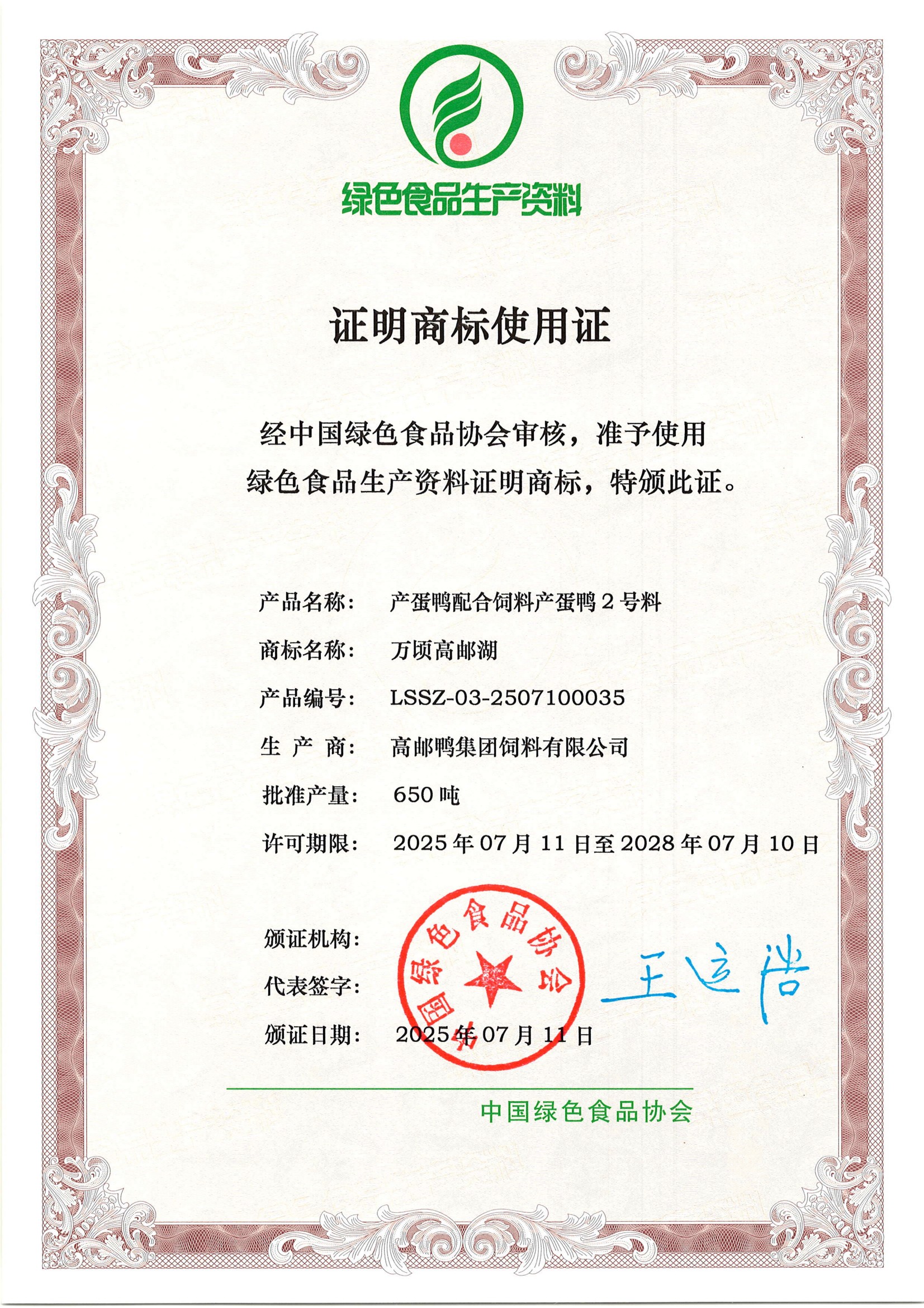 近日,高郵鴨集團申報的蛋鴨配合飼料成功通過中國綠色食品協(xié)會的最終審核,并獲得綠色食品生產(chǎn)資料證明商標使用證。這一“綠資”認證是國家層面認可的綠色食品生產(chǎn)投入品的最高級別認證之一,為高郵鴨集團產(chǎn)品進入高端農(nóng)產(chǎn)品生產(chǎn)供應(yīng)鏈、拓展綠色食品相關(guān)市場提供了關(guān)鍵資質(zhì)支撐。
