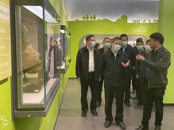 視察期間,到訪領導一行首先聽取了高郵鴨集團(高郵鴨良種繁育中心)運營基本情況與發展規劃的介紹,隨后通過實時監控系統詳細觀摩了高郵鴨保種、全自動籠養以及發酵床養殖舍,并集中參觀了高郵鴨文化展示中心。